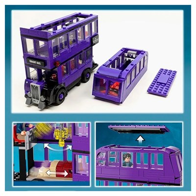 لگو هری پاتر مدل اتوبوس شوالیه (HARRY POTTER 11342) شامل ۴۱۹ قطعه ساختنی و سه عدد مینیفیگور از شخصیتهای برجسته دنیای جادوگری میباشد. این مدل با جزئیات بالا و دقیق طراحی گردیده و مجهز به درب جانبی متحرک، درب بازشوی محفظه داخلی و سقف با قابلیت بازگشایی است. علاوه بر این، فانوس تعبیهشده در فضای داخلی اتوبوس، حین حرکت لرزش ایجاد میکند که بر ارتقاء سطح واقعگرایی تجربه بازی میافزاید. جنس این محصول از پلاستیک مرغوب و مواد اولیه غیرسمی بوده و استفاده از آن برای رده سنی ۶ سال به بالا توصیه میگردد.