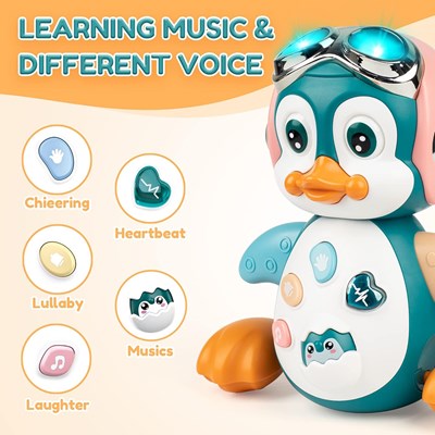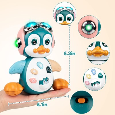 اسباب‌ بازی موزیکال پنگوئن با طراحی جذاب و بهره‌مندی از نورهای LED رنگارنگ، تجربه‌ای شاد و سرگرم‌کننده را برای کودکان فراهم می‌سازد. این محصول مجهز به پنج دکمه با صداهای متنوع از جمله لالایی، خنده و صدای حیوانات بوده و دکمه‌ی قلبی آن با پخش صدای ضربان قلب، موجب ایجاد حس آرامش در نوزاد می‌شود. این اسباب‌ بازی جهت عملکرد به سه عدد باتری قلمی نیاز دارد (باتری‌ها در بسته‌بندی محصول قرار ندارند) و از پلاستیک بادوام و باکیفیت تولید شده است. استفاده از این محصول برای کودکان بالای ۱۸ ماه توصیه می‌شود.
