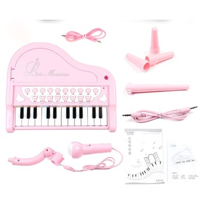اسباببازی پیانو آموزشی ۲۴ کلید، با طراحی زیبا و کاربری آسان، گزینهای مناسب برای آشنایی کودکان با دنیای موسیقی بهشمار میآید. این پیانو مجهز به ورودی MP3 جهت اتصال تلفن همراه و پخش آهنگهای دلخواه بوده و بههمراه میکروفون سیمی ارائه میشود تا کودک بتواند ضمن خوانندگی یا قصهگویی، لحظاتی شاد و آموزنده را تجربه کند. بدنهی محصول از پلاستیک مقاوم و غیرسمی ساخته شده است و در بستهبندی آن، ۳ عدد پایه، جک اتصال، پایه نگهدارندهی میکروفون، کابل AUX و دفترچه راهنما قرار دارد. این دستگاه با استفاده از ۴ عدد باتری قلمی کار میکند (در بستهبندی موجود نیست) و برای کودکان بالای ۳ سال مناسب است.