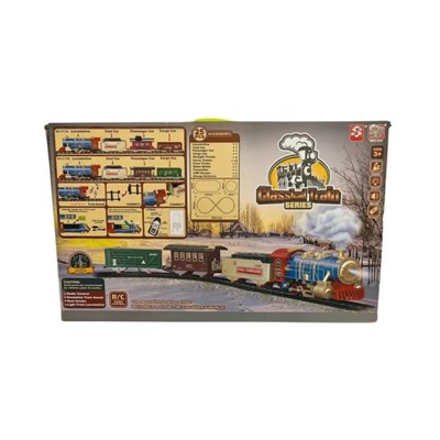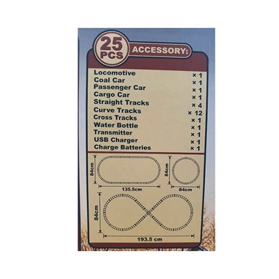 - شامل 25 قطعه دارای یک لوکوموتیو و 3 واگن، ریل های صاف و منحنی ، باتری قابل شارژ، کابل شارژ، ریموت کنترل، قطره چکان،آنتن کنترل