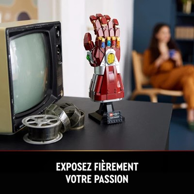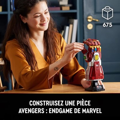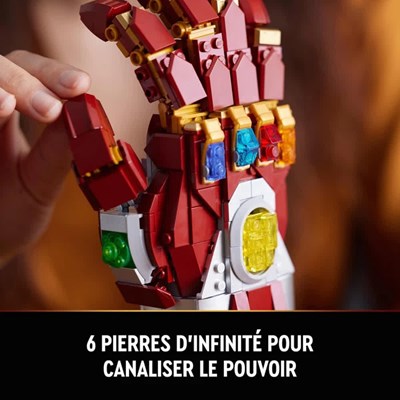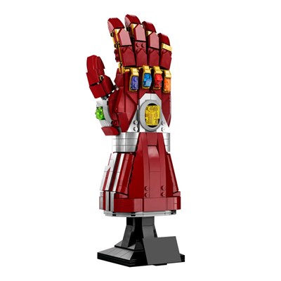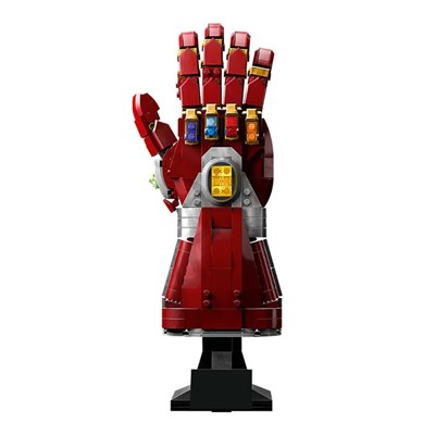 لگو دستکش آیرون من 675 قطعه محصولی فوق العاده با کیفیت ساخته شده از روی فیلم اونجرز سری پایان بازی ساخته شده است. این محصول مخصوص طرفداران کتاب های کمیک و دنیای مارول می باشد.این دستکش که انگشتانش قابلیت حرکت دارند بر روی پایه ای قرار دارد پس از ساخت به ارتفاع 31 سانتی متر می رسد. دستکش آیرون من هدیه ای مناسب برای کلکسیون داران و یا کسانی که طرفدار آیرون من هستند می باشد. سنگ های ابدیت این محصول که هر یک در فیلم نماد عنصر و یا قدرتی بودند به شکل رنگی بر روی دستکش قرار دارند.