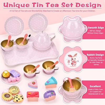 اسباببازی ست چایخوری فلزی طرح خرگوش یک مجموعه جذاب و فانتزی برای بازیهای نمایشی و گروهی کودکان است که بهصورت قابل حمل و جمعوجور داخل یک چمدان عرضه میشود. این ست مناسب بازی تا ۴ نفر بوده و شامل چمدان، ۱ سینی، ۴ بشقاب، ۴ نعلبکی، ۴ فنجان، ۱ قوری، ۱ تل خرگوشی، ۲ تیبگ، ۲ عدد لیمو، ۱۸ عدد کیک و شیرینی، ۱ انبر کیک، ۱ سینی طبقاتی کیک، ۱ کاردک کیک و ۴ قاشق چایخوری است. قطعات این مجموعه از فلز مقاوم و پلاستیک با کیفیت ساخته شدهاند، قابلیت شستشو دارند و برای کودکان بالای ۳ سال گزینهای مناسب و سرگرمکننده محسوب میشوند.