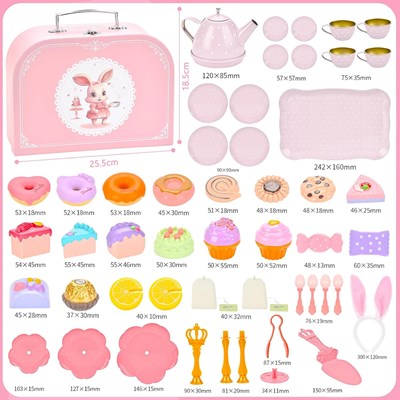 - شامل: چمدان، 1 سینی، 4 بشقاب، 4 نعلبکی، 4 فنجان، 1 قوری، 1 تل خرگوشی، 2 تی بگ، 2 لیمو، 18 کیک و شیرینی، 1 انبر کیک، 1 سینی طبقاتی کیک، 1 کاردک کیک، 4 قاشق چای خوری
