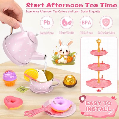 اسباببازی ست چایخوری فلزی طرح خرگوش یک مجموعه جذاب و فانتزی برای بازیهای نمایشی و گروهی کودکان است که بهصورت قابل حمل و جمعوجور داخل یک چمدان عرضه میشود. این ست مناسب بازی تا ۴ نفر بوده و شامل چمدان، ۱ سینی، ۴ بشقاب، ۴ نعلبکی، ۴ فنجان، ۱ قوری، ۱ تل خرگوشی، ۲ تیبگ، ۲ عدد لیمو، ۱۸ عدد کیک و شیرینی، ۱ انبر کیک، ۱ سینی طبقاتی کیک، ۱ کاردک کیک و ۴ قاشق چایخوری است. قطعات این مجموعه از فلز مقاوم و پلاستیک با کیفیت ساخته شدهاند، قابلیت شستشو دارند و برای کودکان بالای ۳ سال گزینهای مناسب و سرگرمکننده محسوب میشوند.