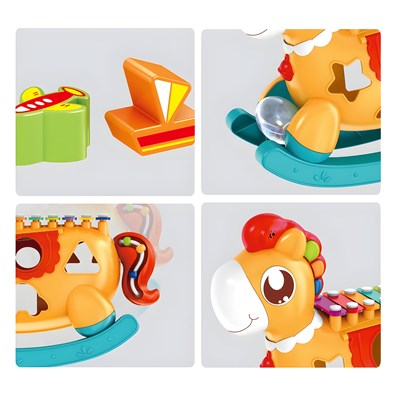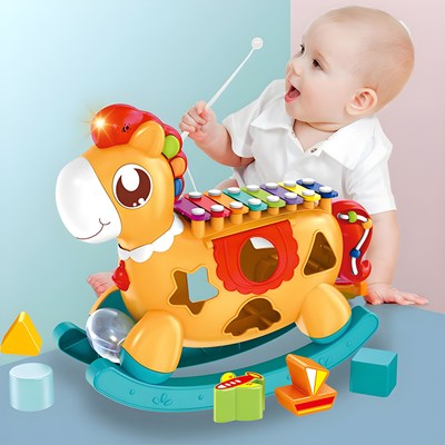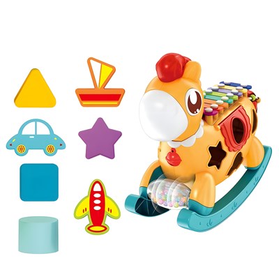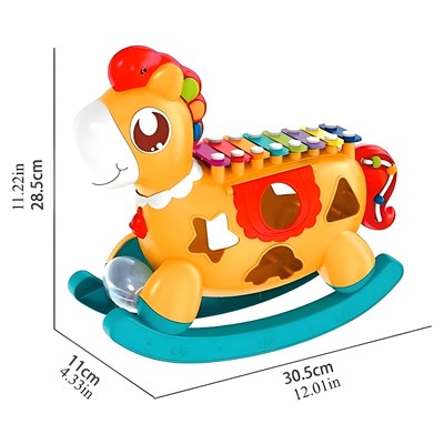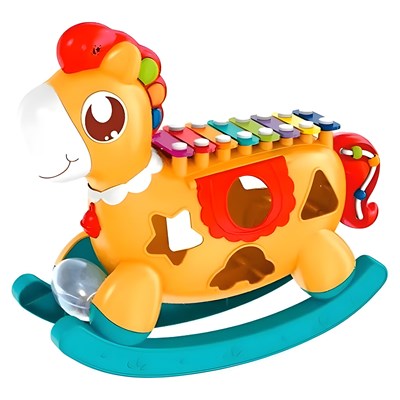 - محتویات شامل: راکر اسب تعادلی بلزدار، 3 برگه نت، 7 مکعب اشکال، 1 مضراب